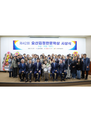 29일 부산일보사 대강당에서 열린 제42회 요산김정한문학상 시상식에서 수상자인 박향 작가와 심사위원, 작가들이 모였다...